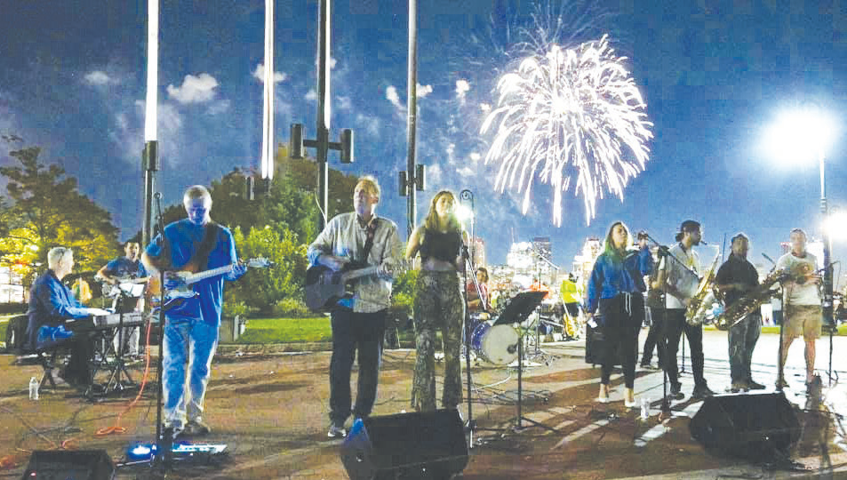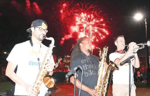 EBNHC Vice President and Zumix board member Steve Snyder’s Don’t Be Denied Band plays under the Boston Harbor fireworks display Friday night at Piers Park.